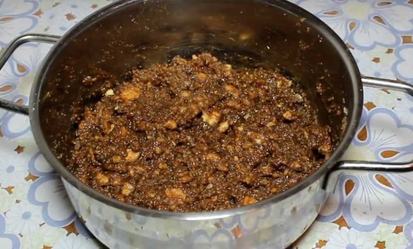 - Горячей шоколадной смесью заливаем раздробленное печенье с орехами.
