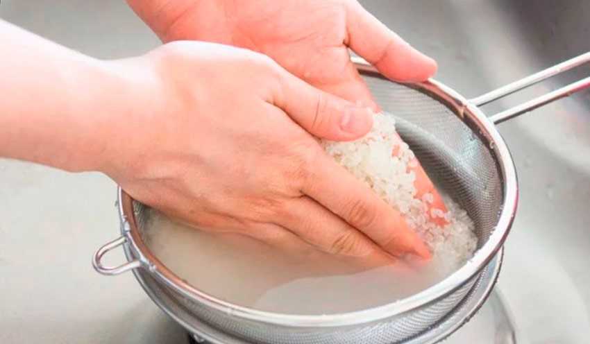 Важно использовать не проточную воду, а сначала залить рис водой в миске и подержать его в ней некоторое время — вода станет матовой
