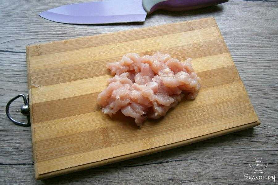 Филе курицы порезать маленькими кусочками или прокрутить через мясорубку, измельчить в блендере.