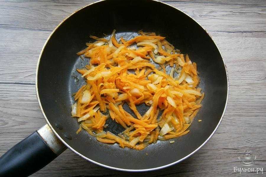 5.Теперь обжарим овощи. Для начала жарим лук на растительном масле около пяти минут. Лук должен получиться прозрачным. Затем добавляем к луку морковь, все солим и перчим по вкусу. Все вместе жарить еще около пяти минут.
