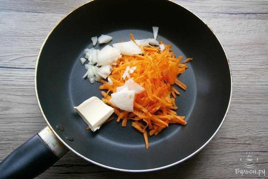 Лук порезать небольшими кусочками, морковку натереть, поместить овощи в сковороду с оставшимся сливочным маслом.