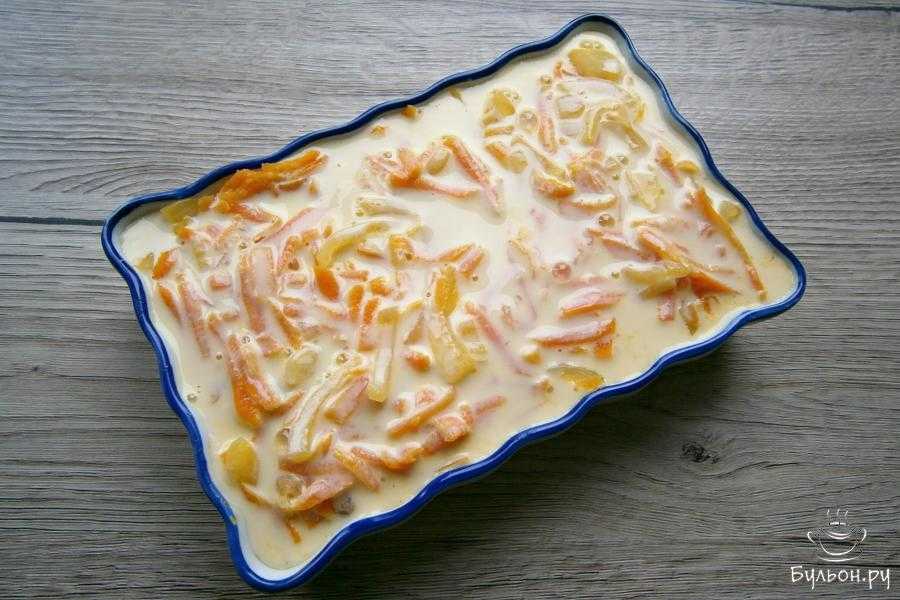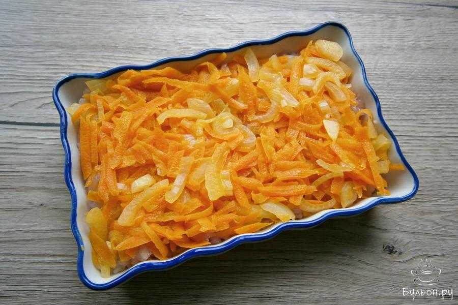 11.Теперь выкладываем в форму фарш, также распределяя его равномерным слоем. Сверху ложем морковь с луком. Все заливаем сметанкой. Запеканка сформирована.