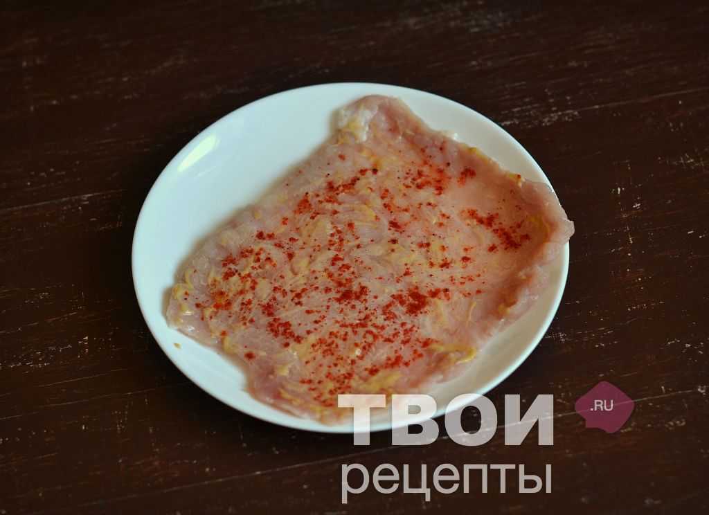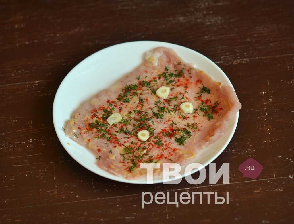 - Мясо нарезать порционными кусками. Каждый отбить. Добавить соль и специи.
