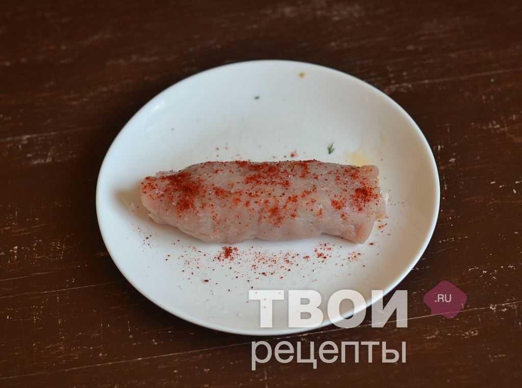 Шаг 1. Подготавливаем мясо для приготовления рулетов. Куриные грудки хорошо промываем, разрезаем вдоль и слегка отбиваем. Затем мясо легка солим и перчим. Можно посолить и поперчить грудки, когда они уже будут свернуты в рулетики.