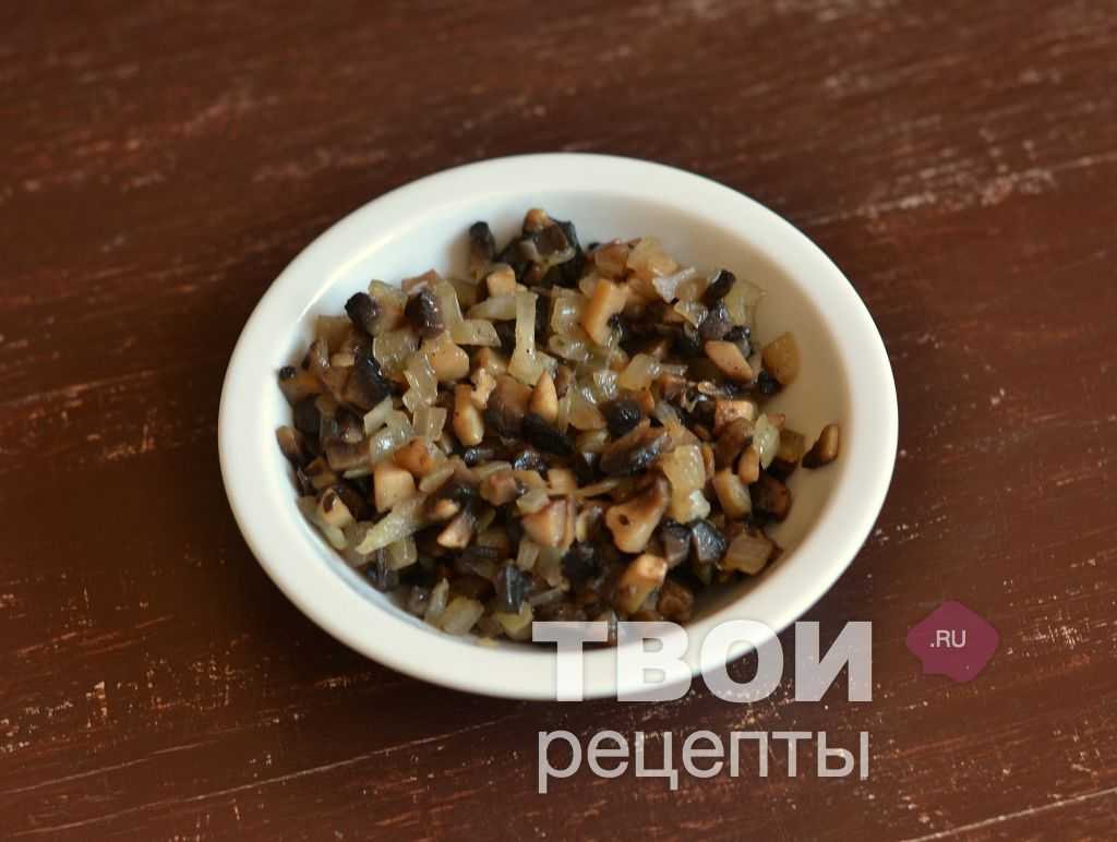 - Лук и шампиньоны нарезаем небольшими кусочками, затем обжариваем грибы с луком на сковороде, на растительном масле до мягкости.
