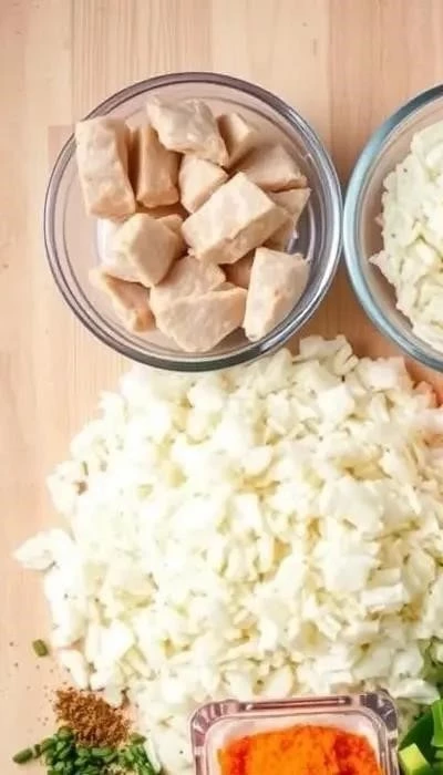 - Приготовление фарша: В миске соединить рыбный фарш, отварной рис, лук, морковь, яйцо, кукурузные хлопья, измельченный чеснок, соль, перец и специи. Тщательно перемешать.