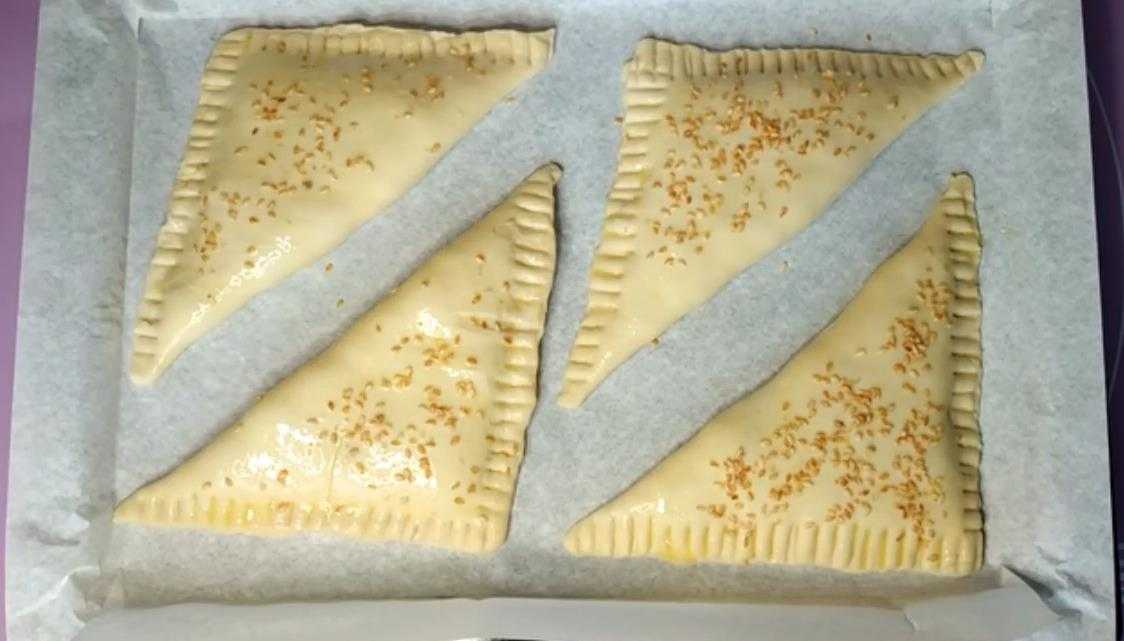 - Самсу поместить на устланный пергаментом лист, смазать яйцом и посыпать кунжутом. Дать пирожкам отстояться (10 минут будет достаточно) и выпекать в духовке при 200 С на 25-30 минут.