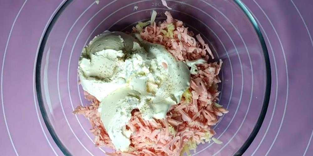 Моцареллу и ветчину измельчить при помощи овощной шинковки. Добавить пюрированный чеснок, сметану и творожный сыр. Посыпать солью, перцем и перемешать до однородности.