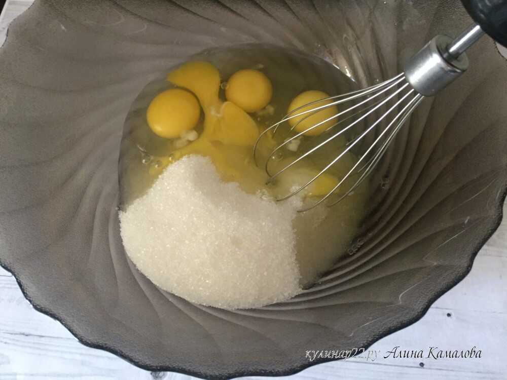 Берем глубокую миску, высыпаем в неё стакан сахарного песка и разбиваем яйца. Тщательно перемешиваем венчиком или блендером до пышной и воздушной массы.