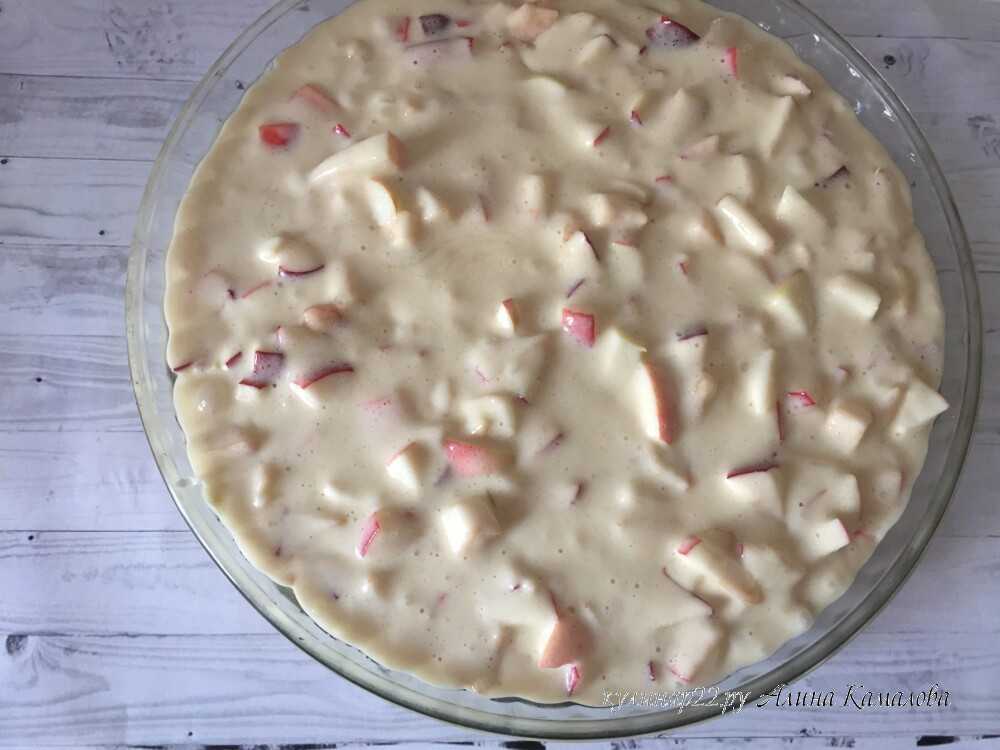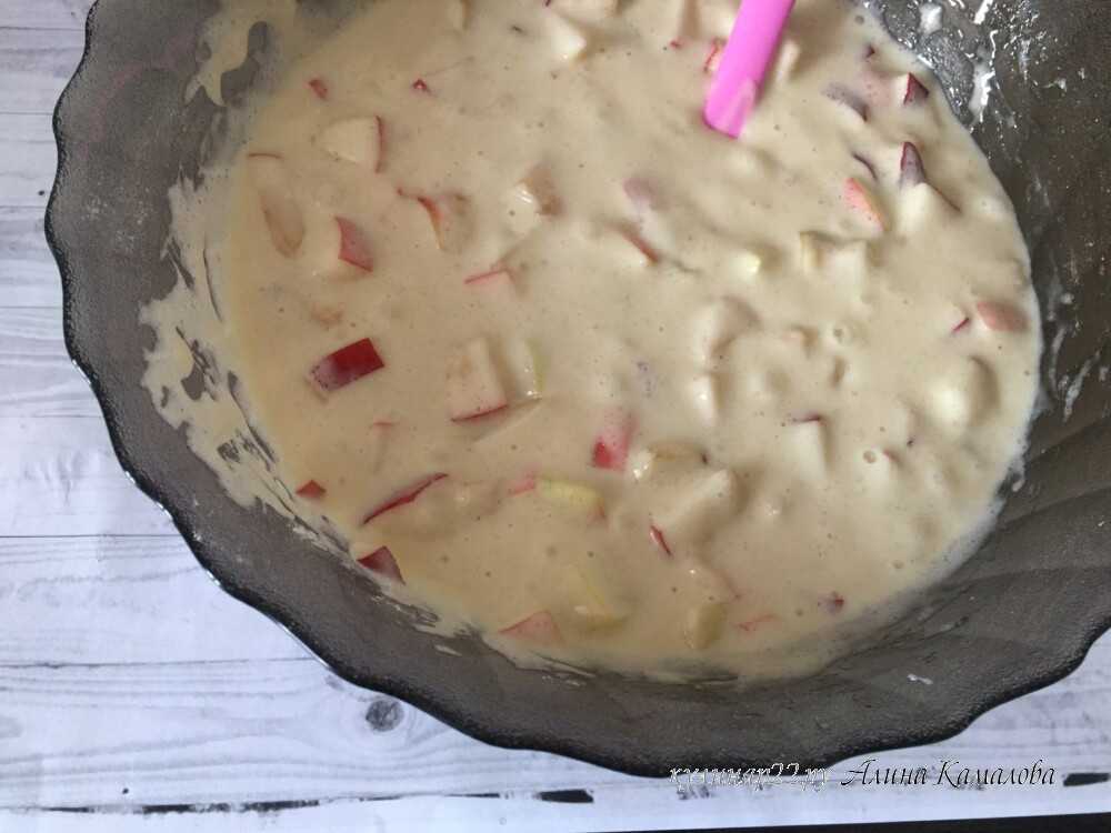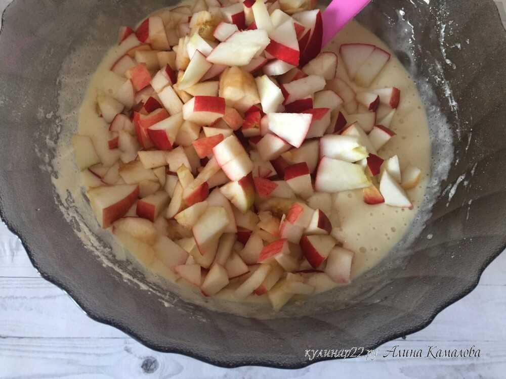 - Очисти и нарежь кубиком яблоки, и тоже перемешай с тестом.