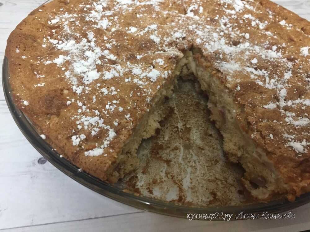 Держите в духовке 40 минут при 180°C при условии, что используете силиконовую форму. Если у вас простой круглый противень, тогда держите пирог 30 минут. Результат запекания оцените деревянной шпажкой. Подавайте сразу и наслаждайтесь удивительным вкусом и приятной структурой шарлотки.