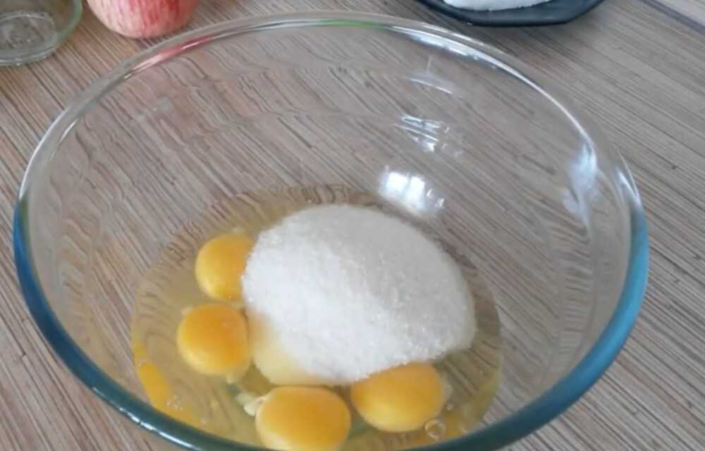 2. Теперь быстренько без промедления, чтобы яблочки не успели почернеть сделайте тесто. Для этого смешайте в обычной миске сахар и яйца. Причем миксер даже не нужен, просто столовой ложкой взбейте, чтобы крупинки сахара начали растворяться и смесь стала однородной по структуре.