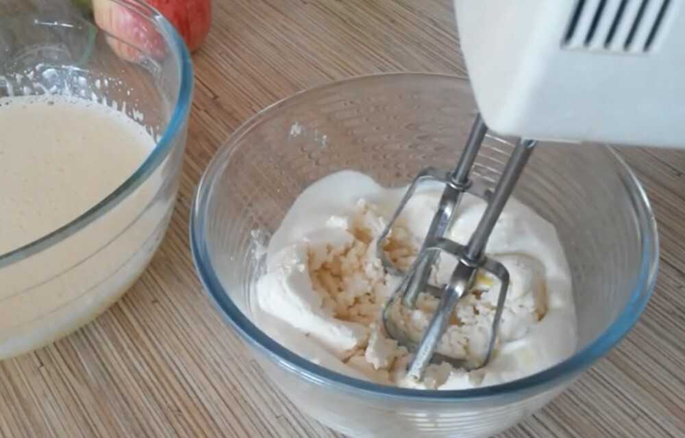 Берём чашку, выкладываем в неё сметану и творог, слегка переминаем вилкой, а затем взбиваем миксером.