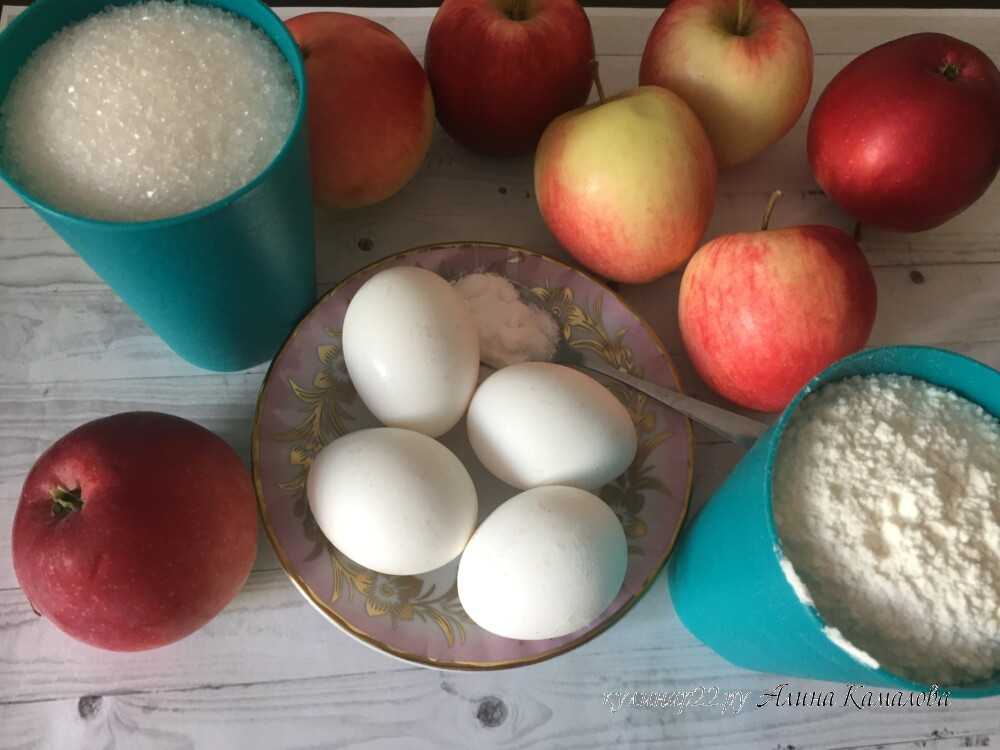 Для приготовления шарлотки с яблоками нам потребуются следующие ингредиенты: