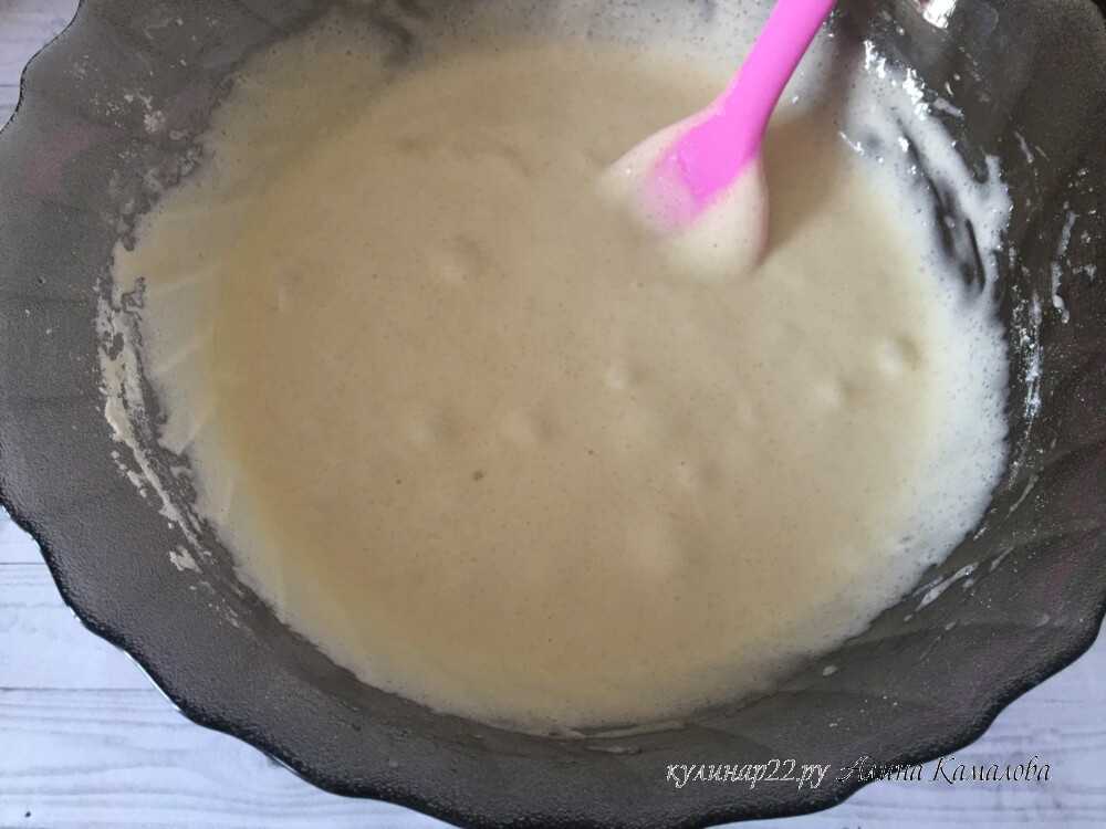 3. Теперь сделайте тесто. Яйца взбейте миксером с сахаром, до исчезновения крупинок, после положите растительного масла, муку с разрыхлителем и влейте молоко. Перемешайте. Получилось жидковязкая консистенция. Ею залейте будущий пирог.