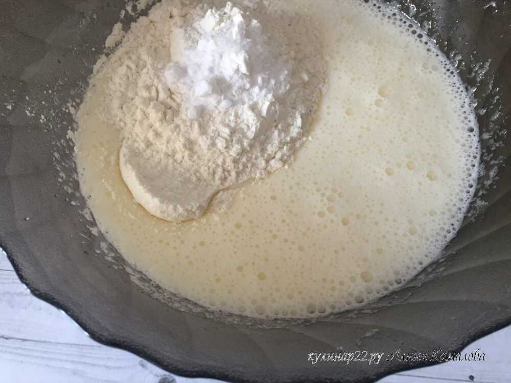 Муку, разрыхлитель и соль смешиваем между собой и по небольшой порции всыпаем в жидкую основу. Хорошо взбиваем миксером.