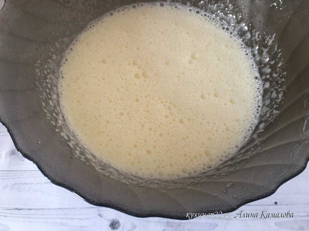 Взбивать нужно довольно долго. Если я использую миксер кухонного комбайна, то пышной пены приходится ждать около 7 минут. Вот так выглядит смесь после взбивания ↓