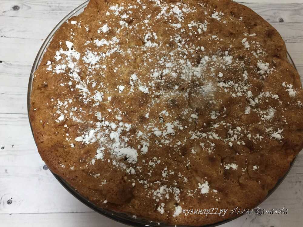 По желанию, присыпаем сверху шарлотку сахарной пудрой.