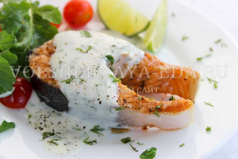 - Сёмгу выньте из духовки. Раскройте фольгу и полейте сливочным соусом.