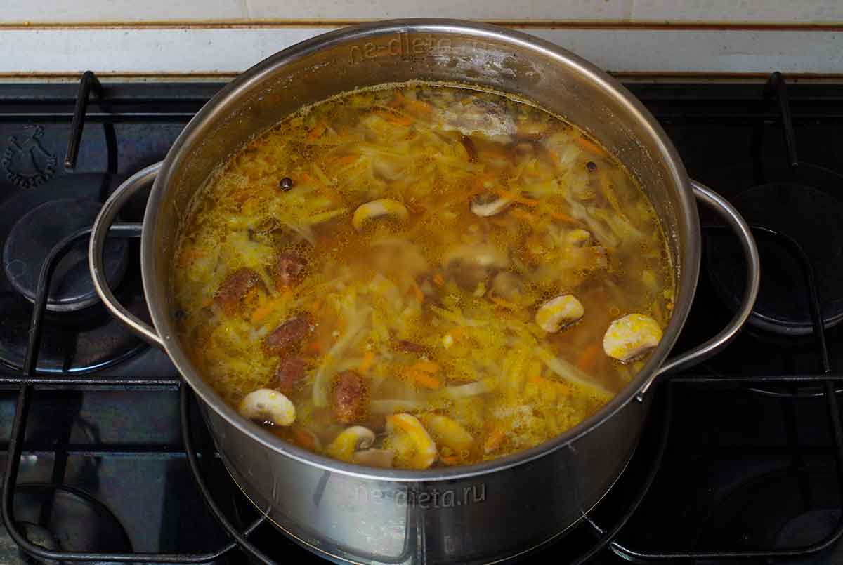 Капусту нашинковать и потушить с маслом. Грибы свежие отварить с морковью, картофелем, корнем петрушки, укропом в 3 л воды. Когда грибы и овощи сварятся, добавить тушеную капусту и варить на медленном огне.