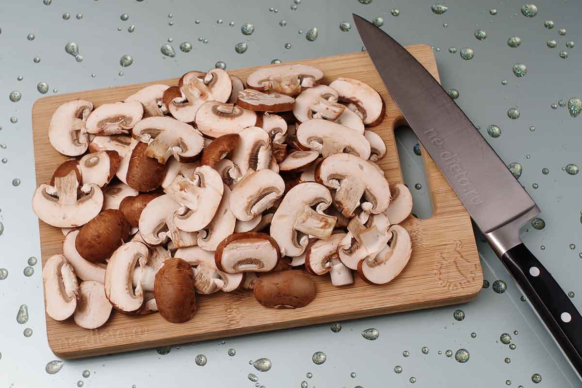 Пришло время шампиньонов. Их нужно тщательно промыть под проточной водой и нарезать тоненькими пластинами. Обжариваем грибы в раскалённом масле до готовности.
