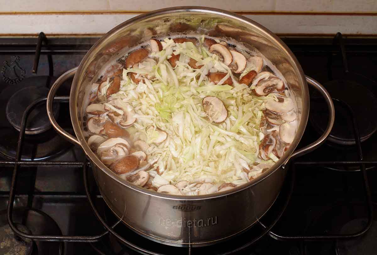 - Спустя полчаса кладём в бульон капусту и варим ещё 20 минут.