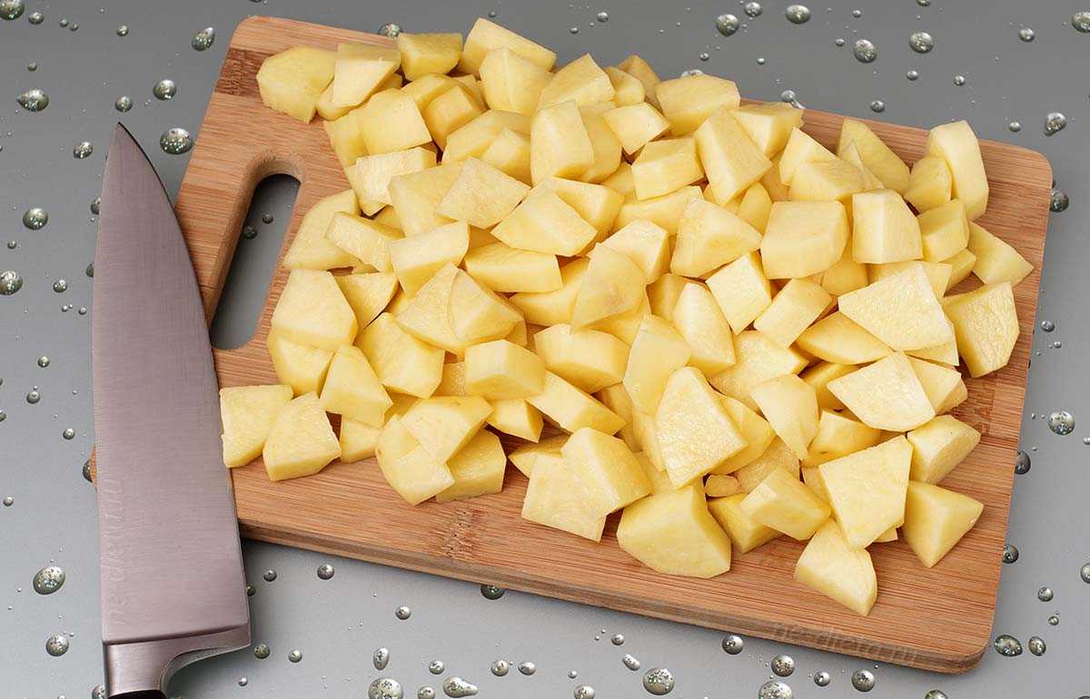 - Помытую картошку чистим и нарезаем на небольшие кубики.