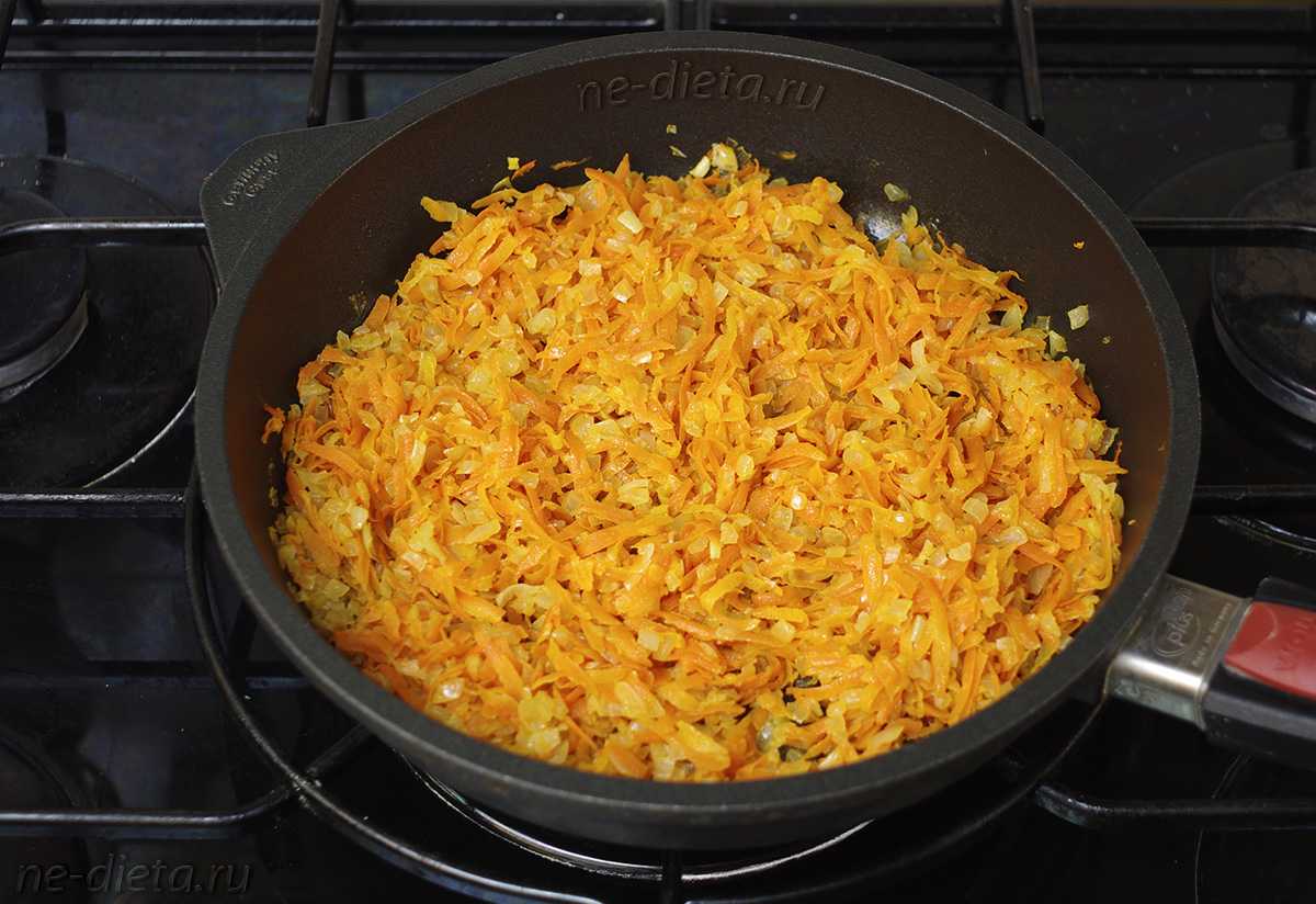 - В сковороду наливаем растительное масло и обжариваем морковь с луком, пока они не приобретут золотистый цвет.