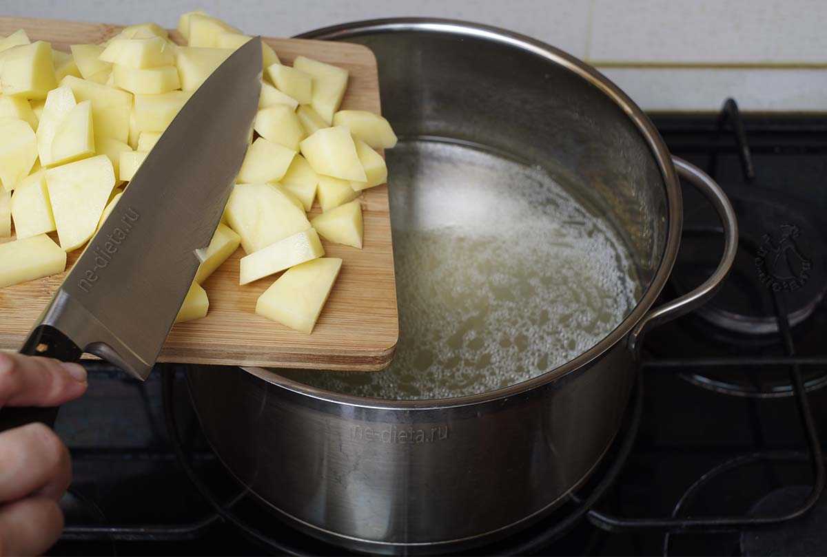 - В бульон забрасываем нарезанный картофель и варим около 10-15 минут.