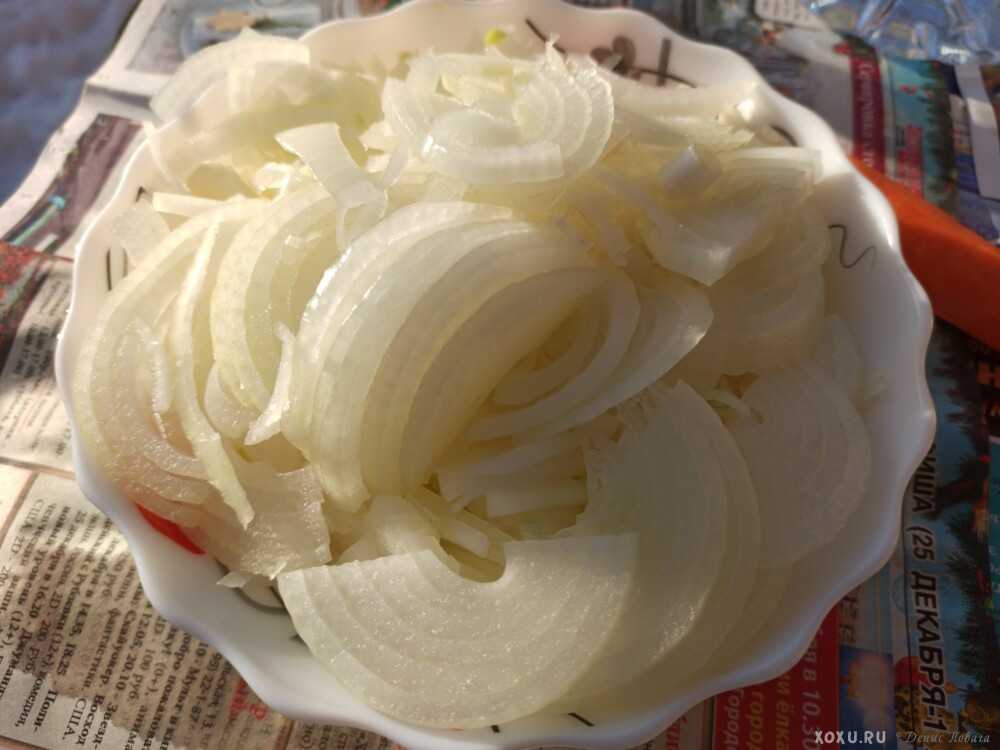 - Тем временем очищаем лук от кожуры и шинкуем его полукольцами широкой толщины.