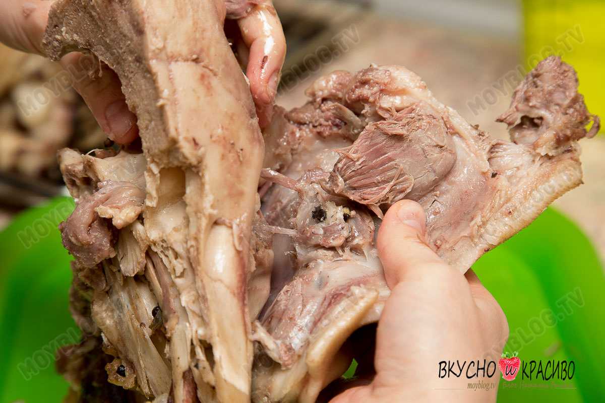 - Вынимаем мясо, охлаждаем его, бульон процеживаем в отдельную посуду.