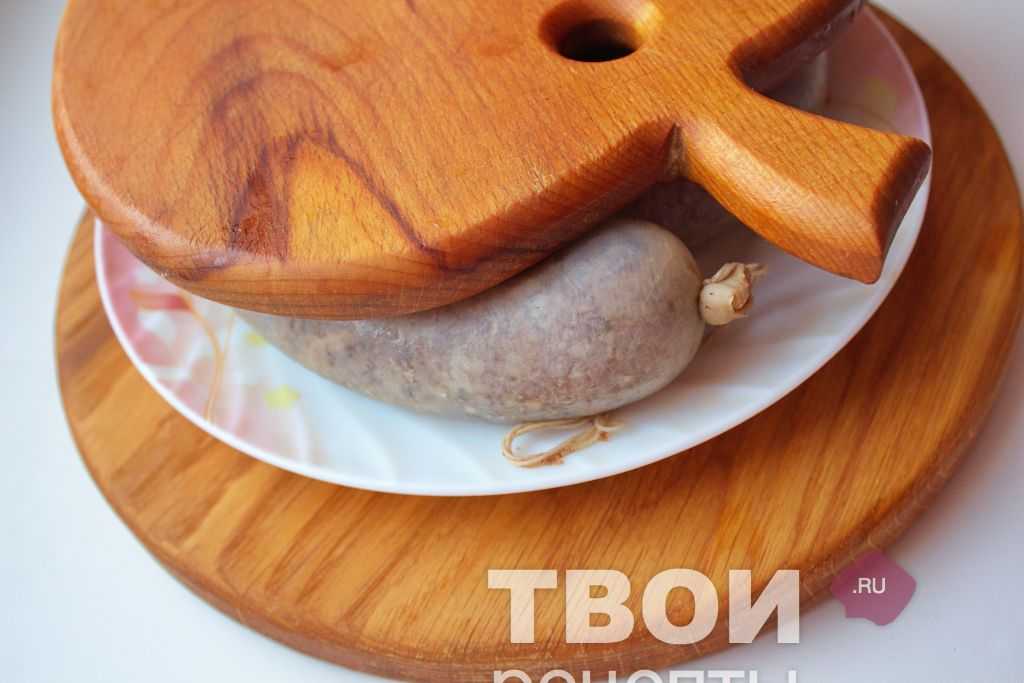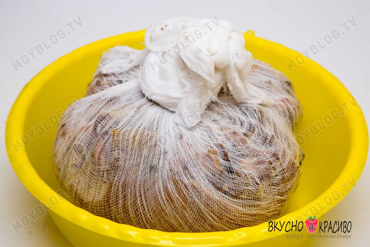 Развязываем узел, расправляем марлю, сверху ставим гнёт. Оставляем на сутки в очень прохладном, но не морозном месте.