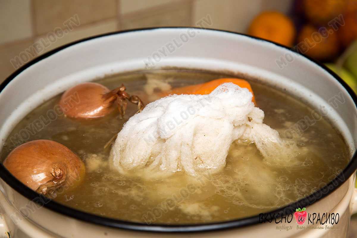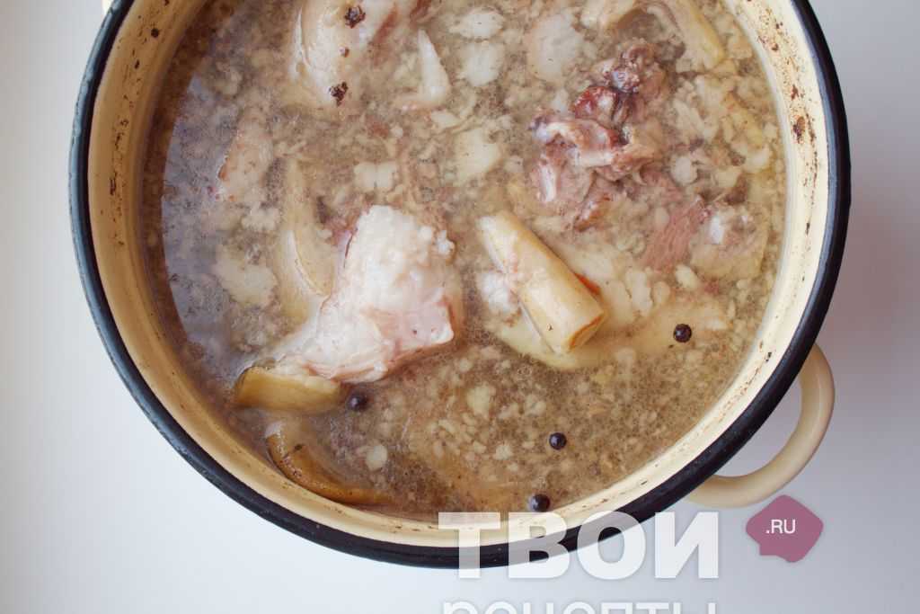 - После того, как вода закипит, снимаем с поверхности накипь, уменьшаем огонь до слабого, прикрываем неплотно крышкой и варим примерно 1 час.