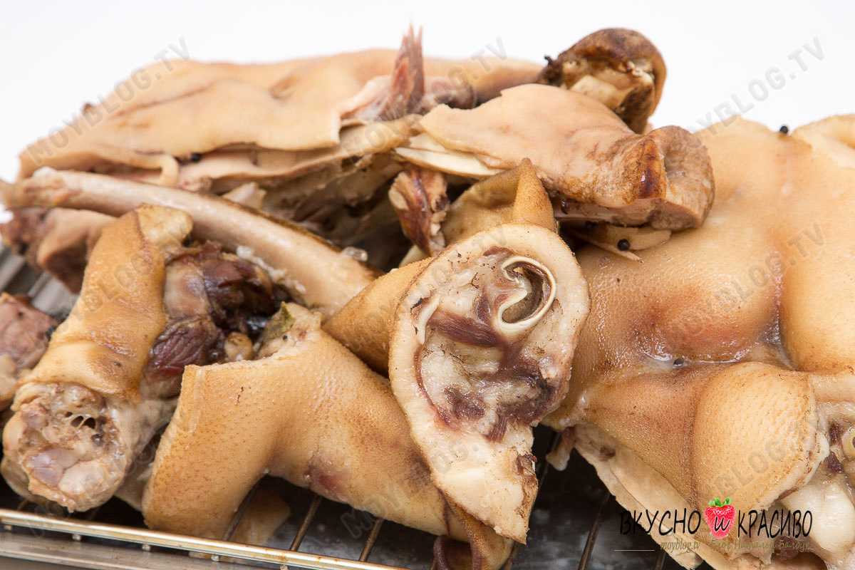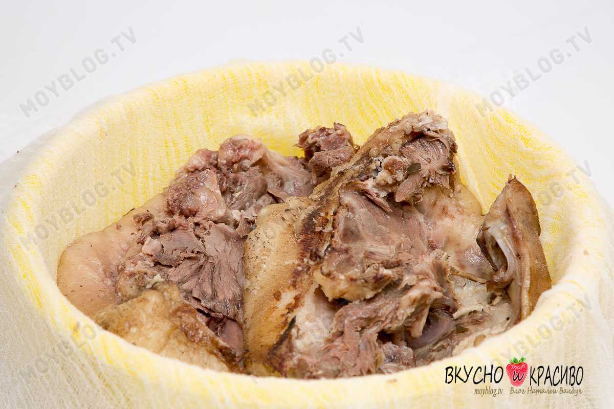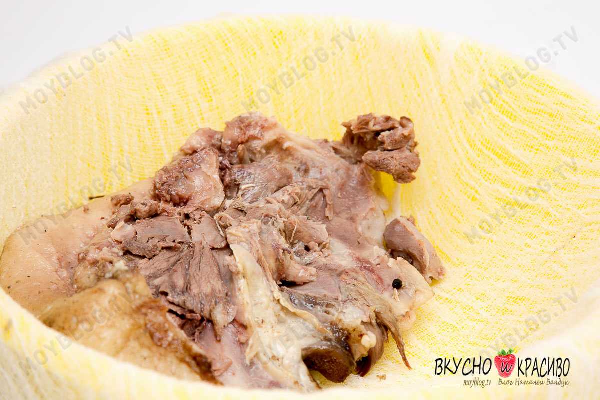 - Затем в крепкую пищевую плёнку либо полиэтиленовые пакеты выкладываем куски мяса и ушей, сверху заливаем холодным бульоном. Завязываем туго пищевую плёнку (пищевые пакеты либо пакет для запекания) и помешаем мясо в плёнке в холодильник под гнёт, любой пресс.