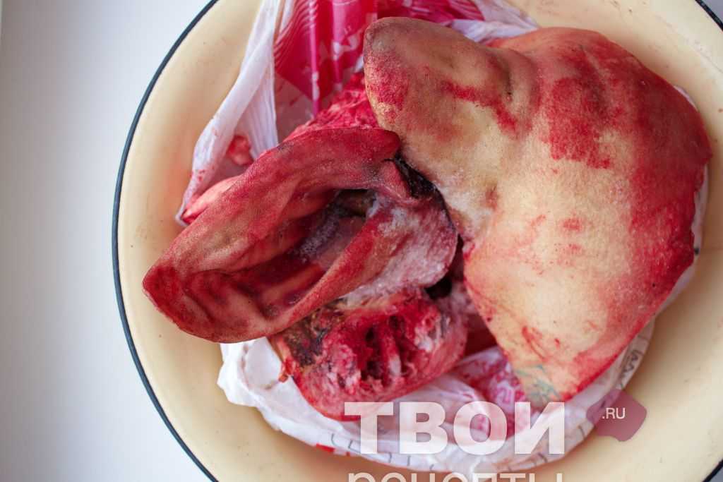 - Свиную голову хорошо почистить, порезать на несколько частей, вырезать глаза и замочить в воде на полчаса;