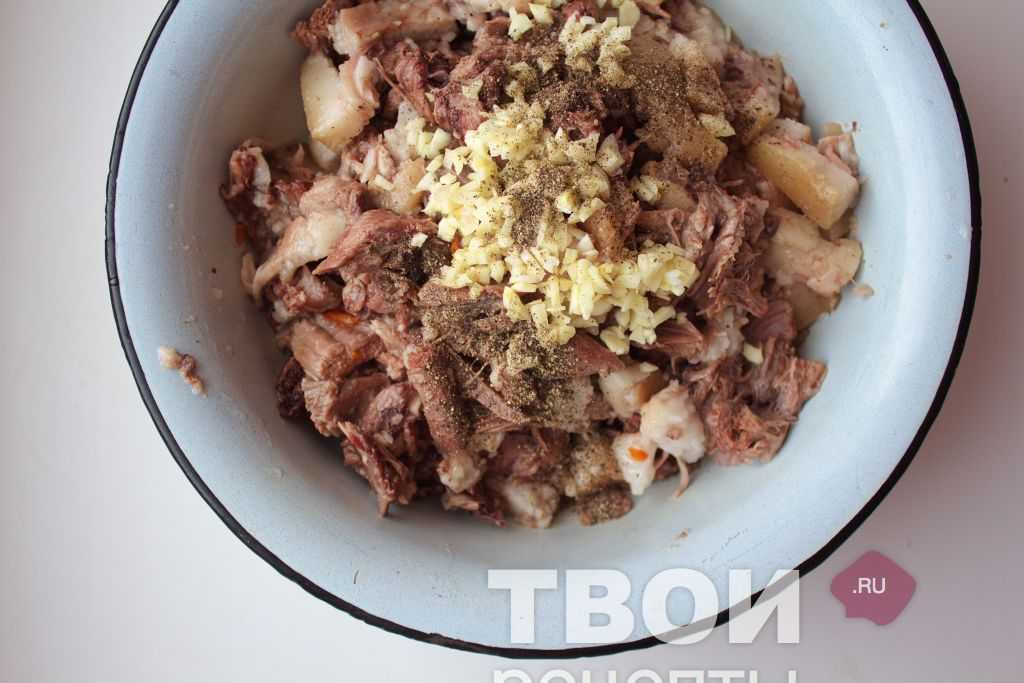 Куски сваренного мяса и свиного жира отделать полностью от костей, приправить рубленным чесноком и чёрным молотым перцем.