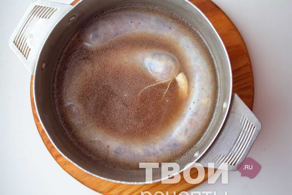 Выключаем огонь под кастрюлей. Отваренное мясо достаем из бульона и даем немного остыть. Если вы использовали еще и язык, то его сразу кладем в холодную воду на 5 минут, чтобы можно было легко снять с него шкуру. Лук и лавровый лист выкидываем — они больше не нужны.