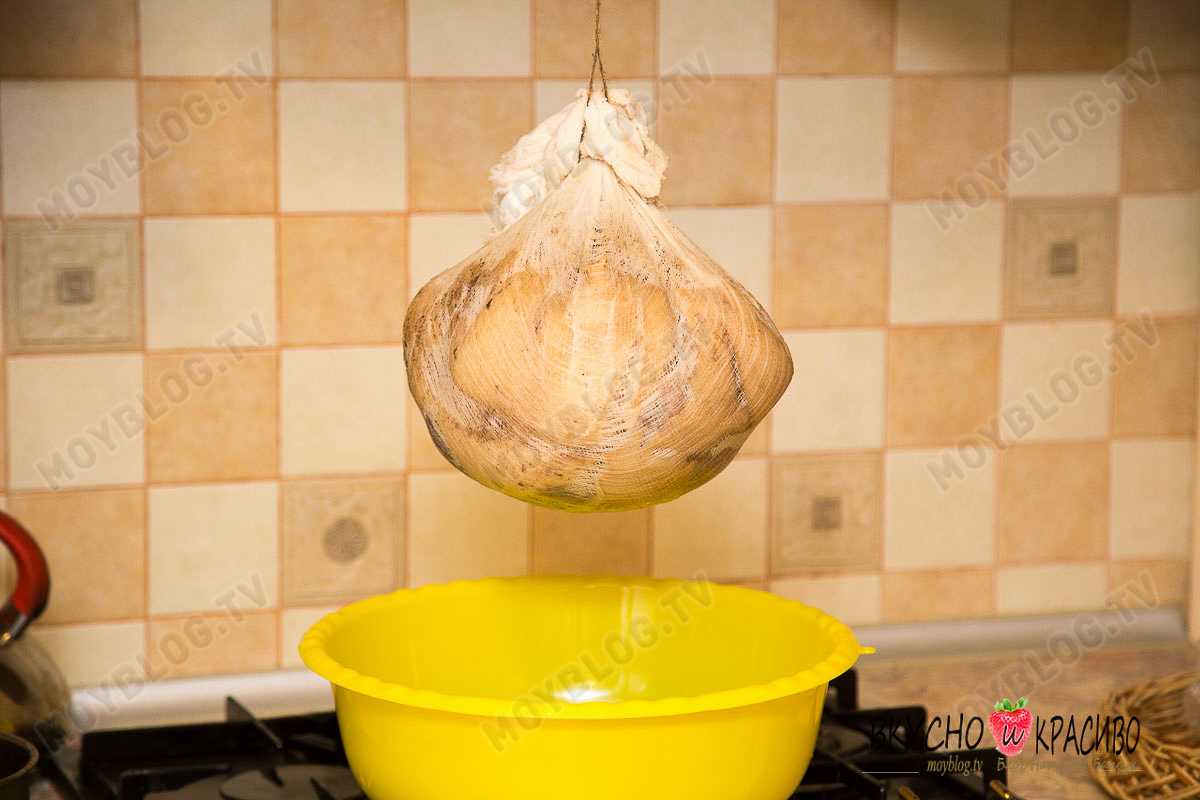 Накрываем дуршлаг блюдом или большой тарелкой и переворачиваем все сооружение. Аккуратно снимаем дуршлаг и затем марлю.