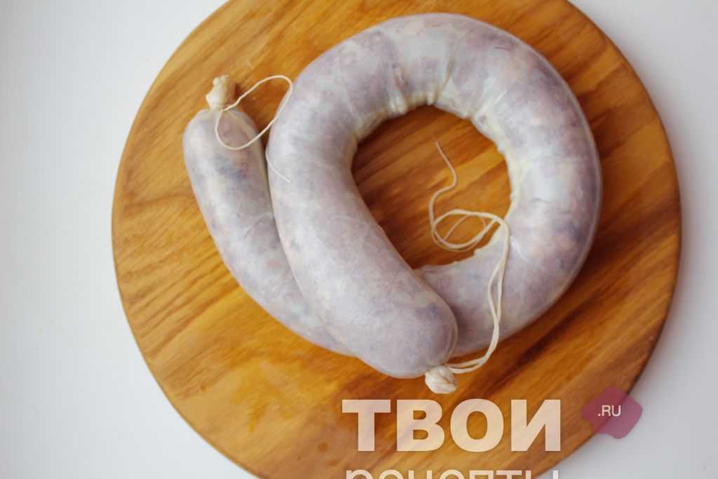 Смешать мясную начинку с подготовленным желатином. На мясорубку без ножа надеть наконечник для начинки колбас — забить кишки плотно полученным мясом и жиром.