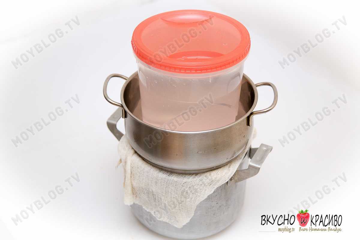 Дуршлаг выстилаем несколькими слоями марли. Заодно делаем для него «подиум» — можно просто в широкую кастрюлю положить перевернутое блюдце. У меня есть небольшой дуршлаг от детского набора игрушек, так что я использую его.