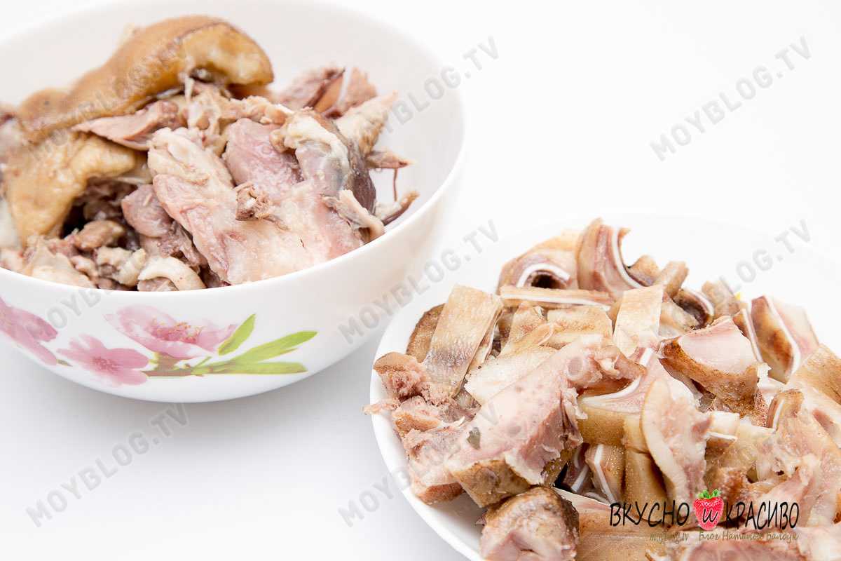 Готовое и подостывшое мясо, снимаем с костей и вместе с языком нарезаем небольшими кусочками. Можно предварительно аккуратно снять свиную кожу, которая будет формировать внешний слой готового блюда. А можно и не заморачиватся этим процессом и нарезать все вместе. Нужно именно стараться нарезать, а не просто размять мясо вилкой или растянуть на волокна.
