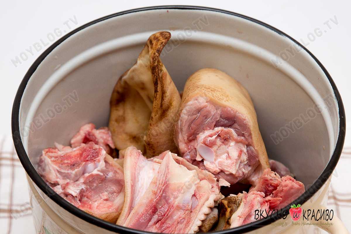 Отмокшее мясо еще раз тщательно промываем, скоблим шкуру ножом и выкладываем в кастрюлю. Заливаем холодной водой, так чтобы она покрывала мясо на 3-4 пальца и ставим на сильный огонь. Если есть язык, то и его используем для приготовления блюда.