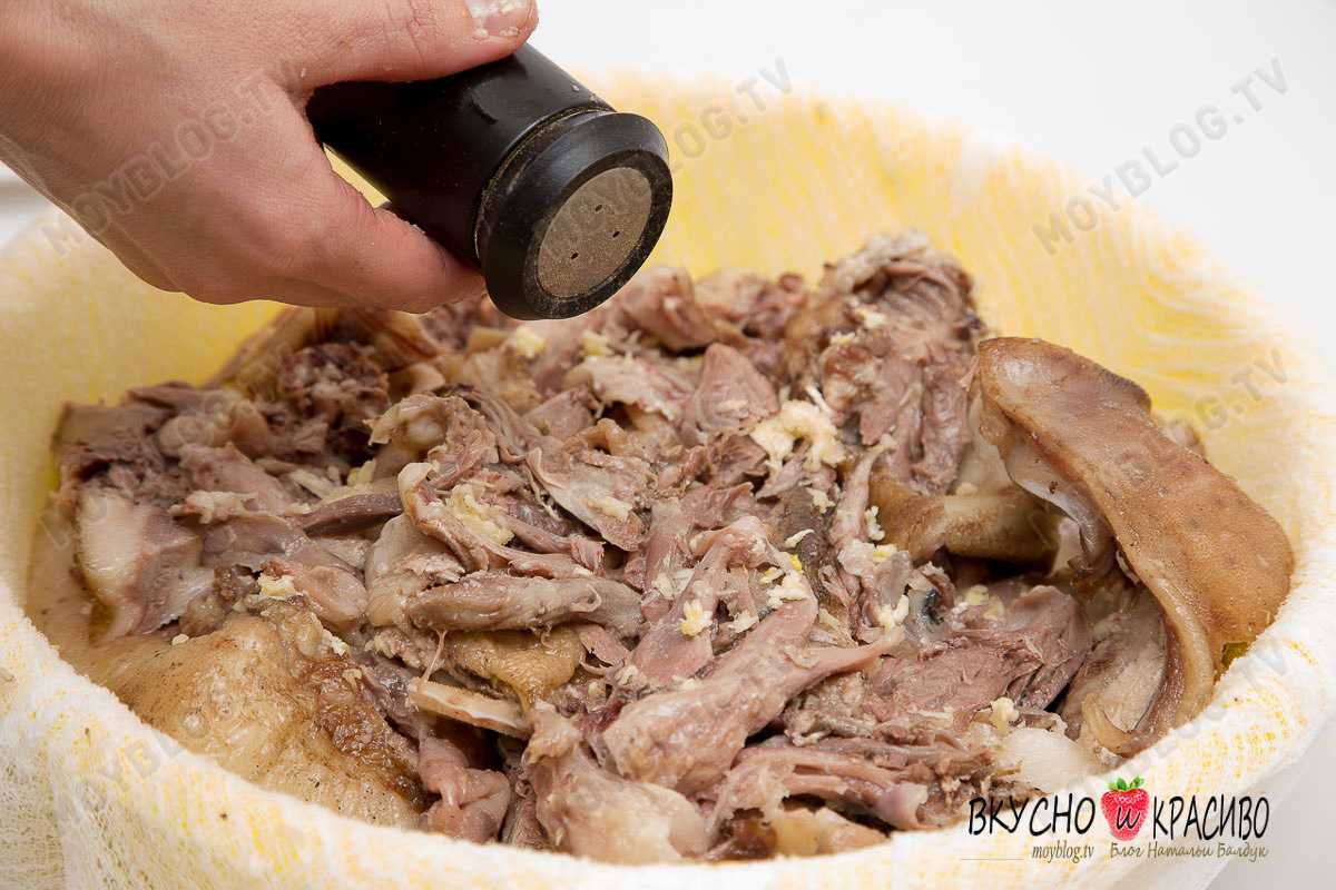 - Из остывшего мяса выбираем кости и режем его вместе с хрящиками мелкими кусочками, присаливаем и перчим по вкусу. Перемешиваем.