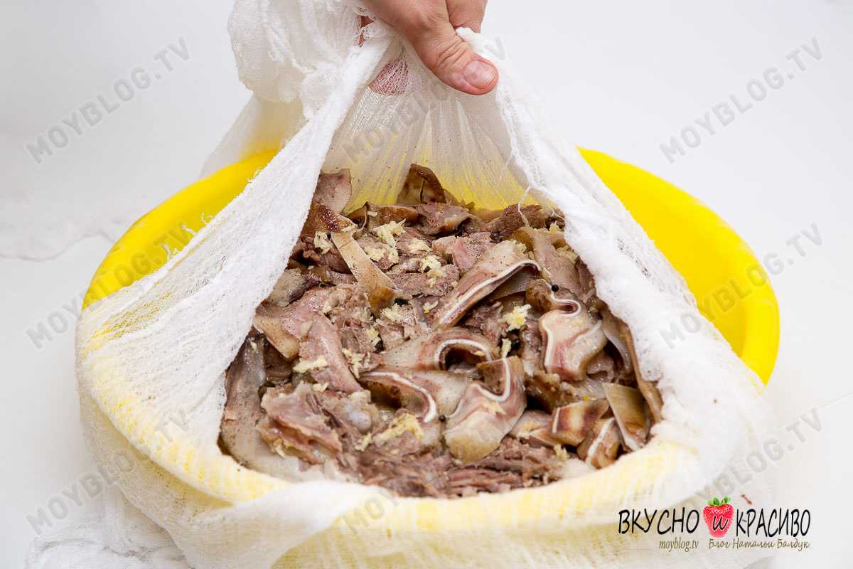 Оставляем мясо на 5-6 часов при комнатной температуре, чтобы из него ушла излишняя жидкость. Затем можно убрать прессованное мясо в холодильник еще минимум часа на 3, а лучше на ночь.