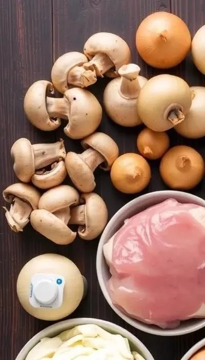 Шаг 3: Подготовка лука и грибов. Лук очистить и нарезать полукольцами. Грибы промыть и нарезать пластинками. Если используете лесные грибы, предварительно отварите их в течение 15-20 минут.