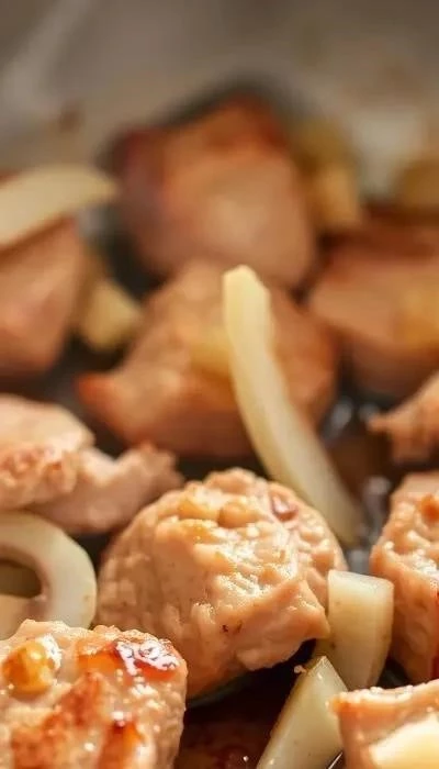 Шаг 4: Тушение свинины с грибами. Добавить к обжаренной свинине лук и обжарить до мягкости. Затем добавить грибы и жарить, пока не испарится вся жидкость. Посолить и поперчить по вкусу.