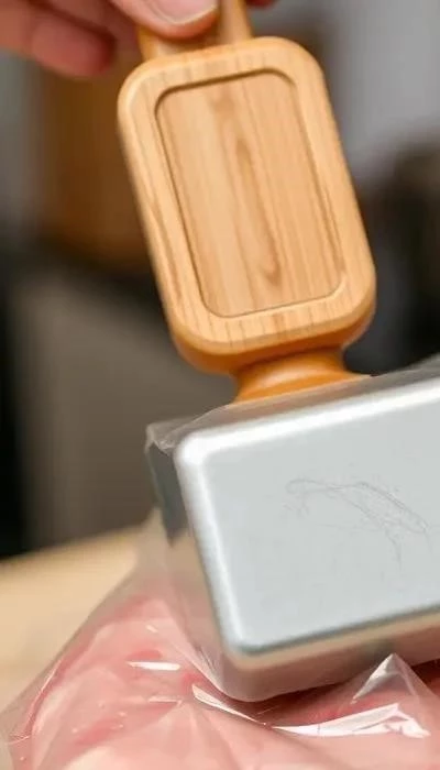 Теперь приступайте к отбиванию мяса. Положите отбивную между двумя слоями пищевой пленки и аккуратно отбейте молотком для мяса. Не бейте слишком сильно, чтобы не повредить структуру мяса. Отбивайте от центра к краям, равномерно распределяя удары. Совет: Чтобы отбивные получились более нежными, можно слегка наколоть их вилкой с обеих сторон.