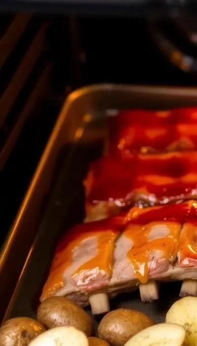 Картофель очистите и нарежьте крупными дольками. В миске смешайте картофель с растительным маслом, солью, черным перцем, паприкой и сушеным розмарином. Выложите картофель на отдельный противень, застеленный пергаментной бумагой. Запекайте в духовке вместе с ребрышками в течение 30-40 минут, периодически переворачивая, чтобы картофель равномерно пропекся и стал золотистым.