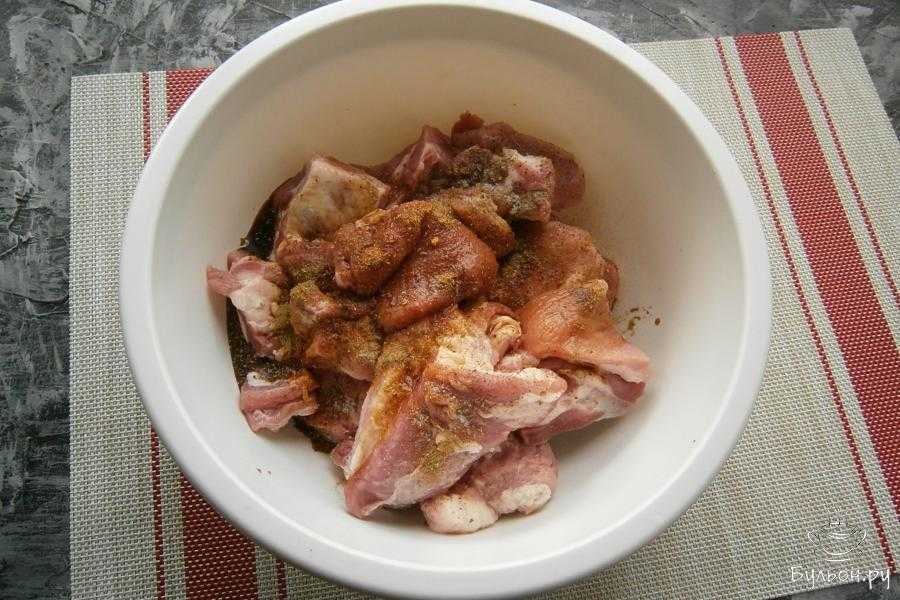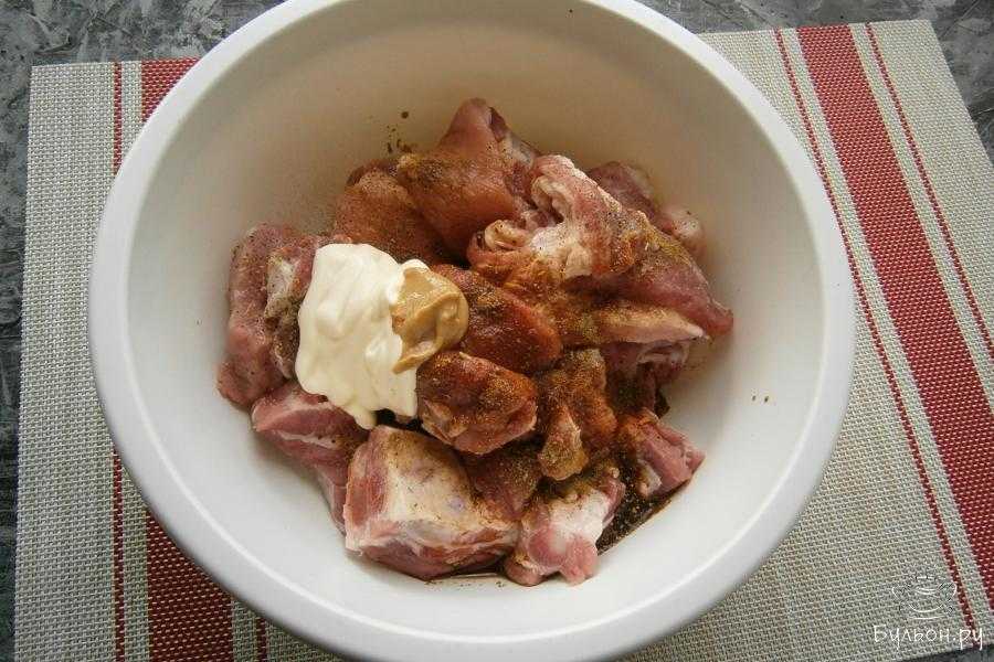 Чтобы мясо получилось более нежным и быстрее приготовилось, его просто необходимо замариновать. Поэтому, отправляем мясо в глубокую чашку, добавляем к ним горчицу, майонез, раздавленный чеснок, соль перец по вкусу. Также можно добавить любимые специи. Хорошо перемешиваем руками, оставляем минимум на час, лучше всего оставить на ночь.