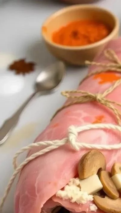 На каждый пласт свинины выложите небольшое количество грибной начинки и посыпьте тертым сыром и зеленью. Аккуратно сверните мясо в рулет и закрепите его зубочистками или перевяжите кулинарной нитью. Это поможет рулетам сохранить форму во время приготовления.